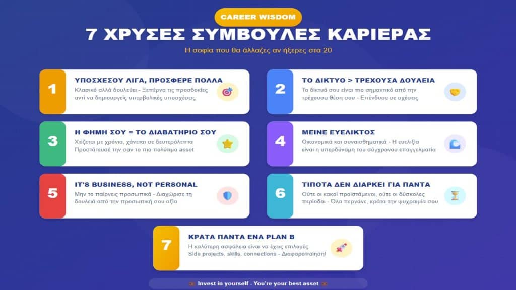 Οι συμβουλές αυτές συνδέουν εμπειρία, νοοτροπία και πρακτική σοφία, δείχνοντας ότι η επιτυχία δεν εξαρτάται μόνο από δεξιότητες ή τίτλους, αλλά κυρίως από τη στρατηγική σκέψη και την προσωπική στάση.