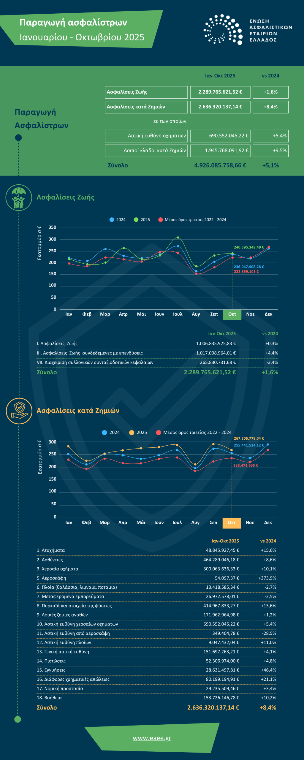 Στα 4,9 δισ. ευρώ διαμορφώθηκε το σύνολο παραγωγής ασφαλίσεων το 10μηνο του 2025, αυξημένο κατά +5,1% έναντι του αντίστοιχου περσινού διαστήματος, σύμφωνα με τα στοιχεία που δημοσίευσε η ΕΑΕΕ