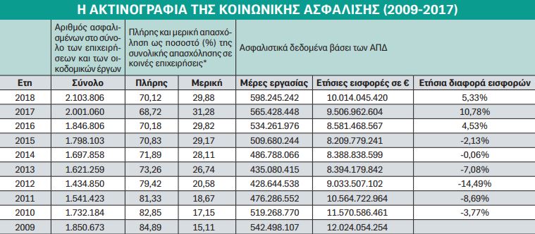 Όμως από το 2013 ο αριθµός των ασφαλισµένων άρχισε να αυξάνεται σταδιακά και επανήλθε στα επίπεδα του 2009 ήδη από το 2016, µε µια σηµαντική διαφορά: οι εισπραττόµενες εισφορές συνέχισαν να µειώνονται σε 8,5 δισ. ευρώ γιατί η µερική απασχόληση των µισθωτών είχε σχεδόν διπλασιαστεί, αυξανόµενη από 15,1% το 2009 σε 29,8% το 2016, αλλά και, το βασικότερο, το µέσο ηµεροµίσθιο είχε µειωθεί κατά 20,14%, από 56,06 ευρώ το 2009 σε 44,77 ευρώ το 2016. Αντίστοιχα, σήµερα, που ο αριθµός των ασφαλισµένων ξεπερνά κατά σχεδόν 250.000 τους ασφαλισµένους του 2009, οι εισπραττόµενες εισφορές συνεχίζουν να υπολείπονται κατά 2 δισ. ευρώ από αυτές του 2009.