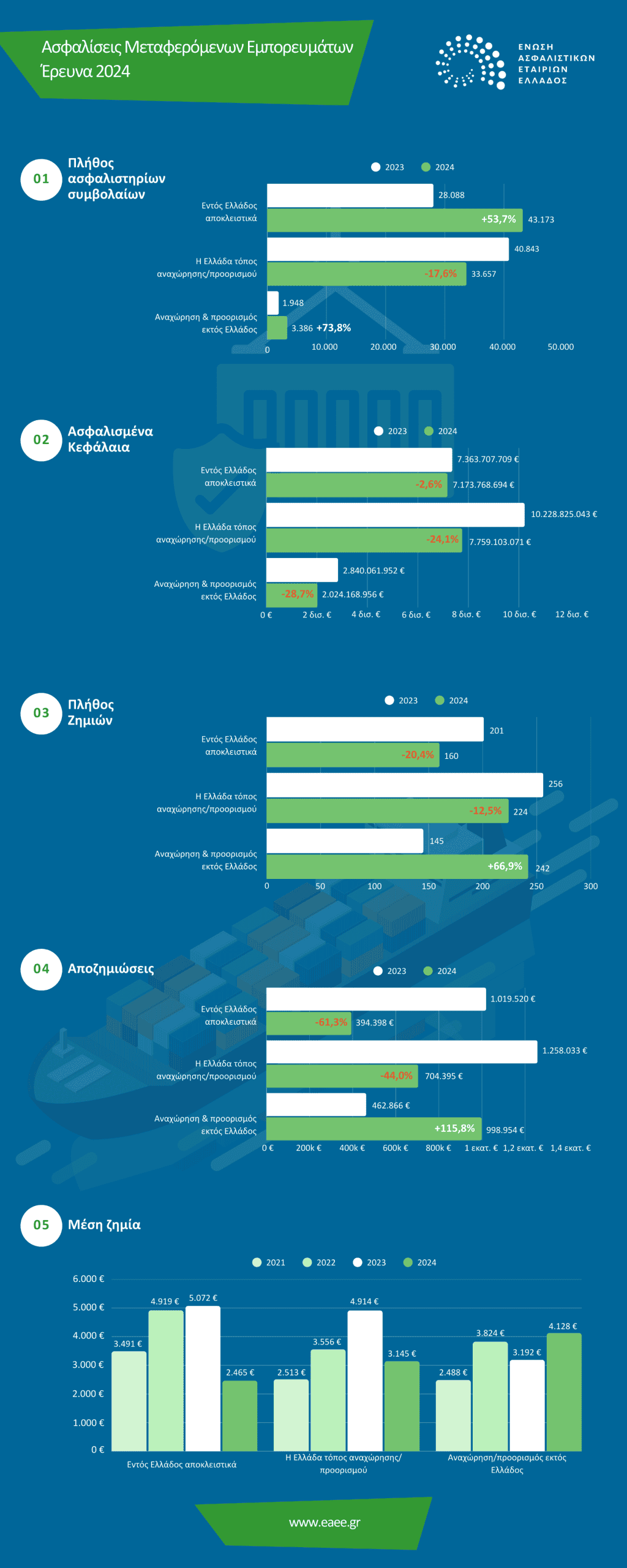 Την Έρευνα Έτους 2024 για τις Ασφαλίσεις Μεταφερόμενων Εμπορευμάτων δημοσίευσε η Ένωση Ασφαλιστικών Εταιρειών Ελλάδος. Περιλαμβάνονται τα στοιχεία 17 ασφαλιστικών επιχειρήσεων με καθεστώς εγκατάστασης, οι οποίες εκτιμάται ότι συγκεντρώνουν το 70% της συνολικής παραγωγής ασφαλίστρων των ασφαλίσεων μεταφερόμενων εμπορευμάτων, εκ των επιχειρήσεων που δραστηριοποιούνται στην Ελλάδα.