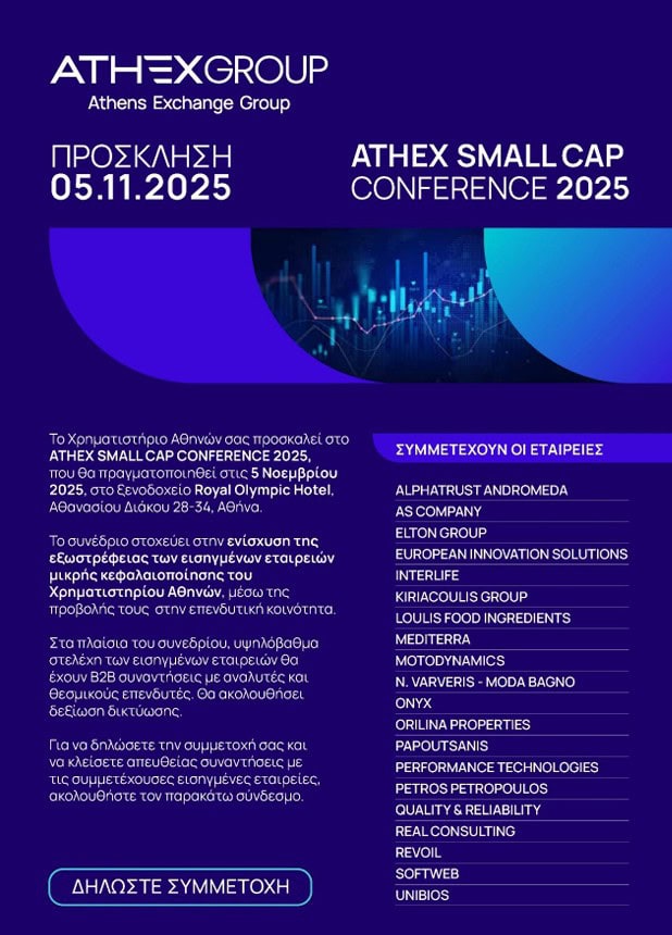 Το Χρηματιστήριο Αθηνών διοργανώνει το ΑΤΗΕX Small Cap Conference στις 5 Νοεμβρίου 2025 στο Royal Olympic Hotel. Στο πλαίσιο του επενδυτικού συνεδρίου, υψηλόβαθμα στελέχη των εισηγμένων εταιρειών θα έχουν Β2Β συναντήσεις με αναλυτές και θεσμικούς επενδυτές.