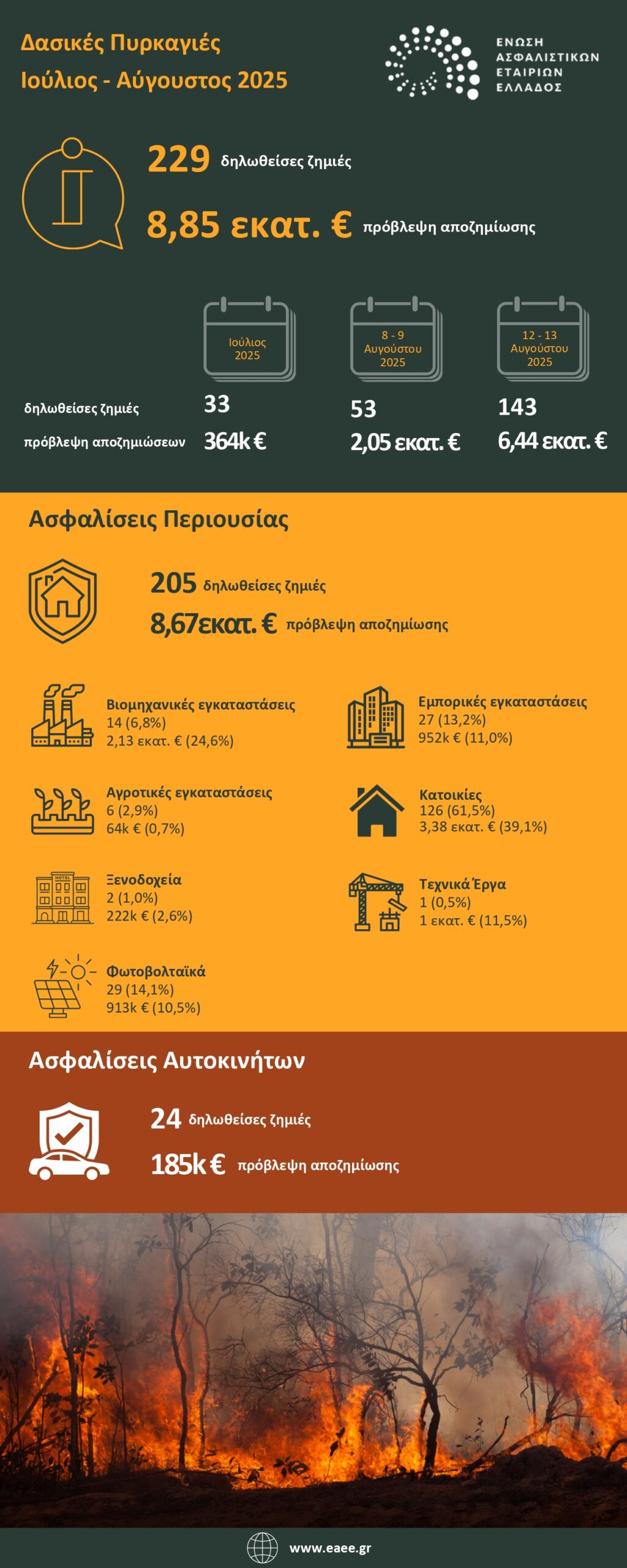 Ολοκληρώθηκε η έρευνα της Ένωσης Ασφαλιστικών Εταιριών Ελλάδος (ΕΑΕΕ) με σκοπό την πρώτη εκτίμηση των αποζημιώσεων της ελληνικής ασφαλιστικής αγοράς για ζημιές περιουσίας και αυτοκινήτου από τις δασικές πυρκαγιές που έπληξαν διάφορες περιοχές της χώρας το καλοκαίρι του 2025 (Ιούλιο και Αύγουστο).