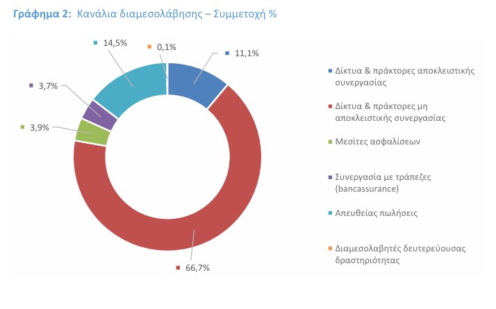 Κυριαρχεί στις ασφαλίσεις νομικής προστασίας η διαμεσολάβηση μέσω δικτύων και πρακτόρων μη αποκλειστικής συνεργασίας (66,7% του συνόλου της παραγωγής ασφαλίστρων του κλάδου), ακολουθούμενη από τις απευθείας πωλήσεις (14,5% αντίστοιχα).