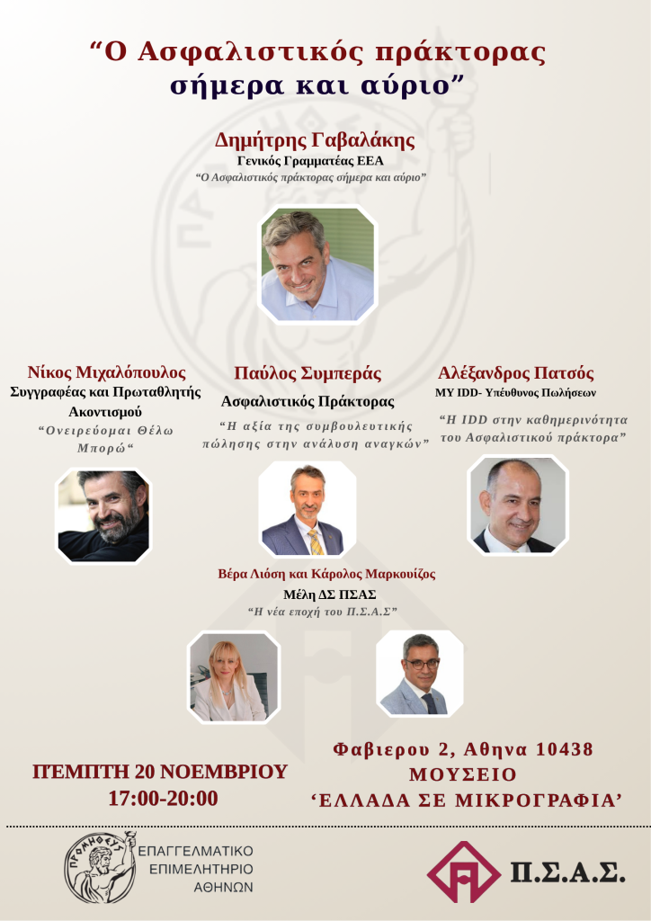 Την Πέμπτη 20 Νοεμβρίου 2025, από τις 17:00 έως τις 20:00, το Μουσείο «Ελλάδα σε Μικρογραφία» στην καρδιά της Αθήνας θα φιλοξενήσει μια εκδήλωση αφιερωμένη στον σύγχρονο και αυριανό ρόλο του ασφαλιστικού πράκτορα. Την εκδήλωση, με τίτλο «Ο Ασφαλιστικός Πράκτορας σήμερα και αύριο», συνδιοργανώνουν ο Πανελλήνιος Σύνδεσμος Ασφαλιστικών Συμβούλων (ΠΣΑΣ) και το Επαγγελματικό Επιμελητήριο Αθηνών (ΕΕΑ).