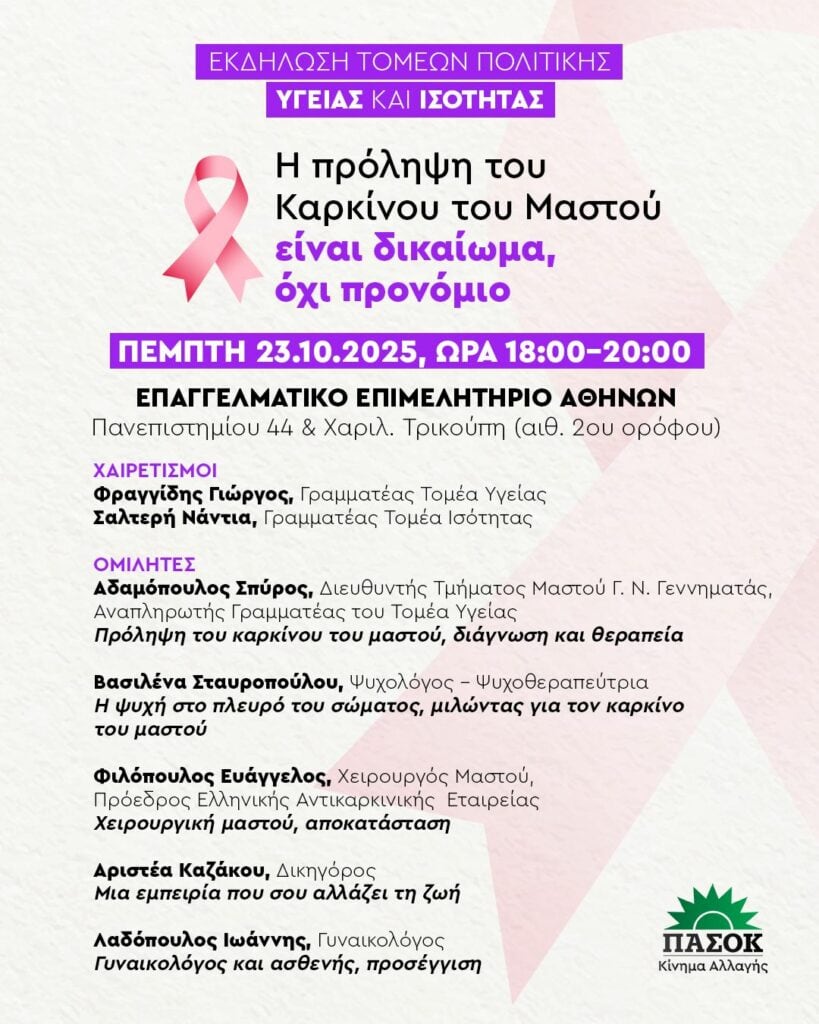 Με το μήνυμα «Η πρόληψη του Καρκίνου του Μαστού είναι δικαίωμα, όχι προνόμιο», οι Τομείς Πολιτικής Υγείας και Ισότητας του ΠΑΣΟΚ – Κινήματος Αλλαγής διοργανώνουν ενημερωτική εκδήλωση την Πέμπτη 23 Οκτωβρίου 2025, από τις 18:00 έως τις 20:00, στο Επαγγελματικό Επιμελητήριο Αθηνών (Πανεπιστημίου 44 & Χ. Τρικούπη, αίθουσα 20ού ορόφου).