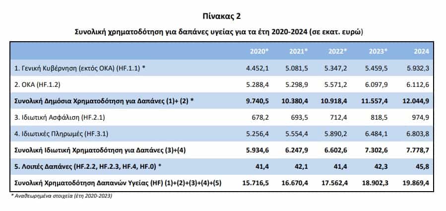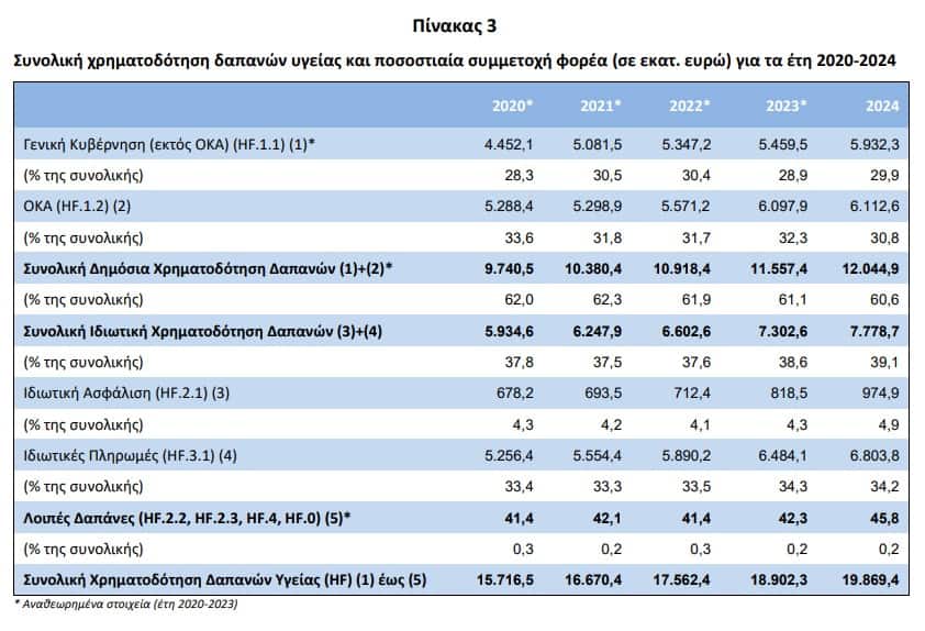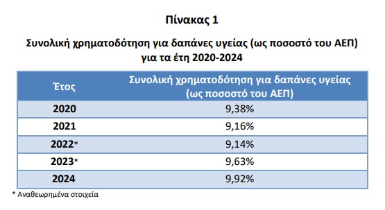 Από τα στοιχεία προκύπτει ότι η συνολική χρηματοδότηση για τις δαπάνες υγείας ως προς το ΑΕΠ ανήλθε στο 9,92% για το έτος 2024 έναντι 9,63% του έτους 2023.