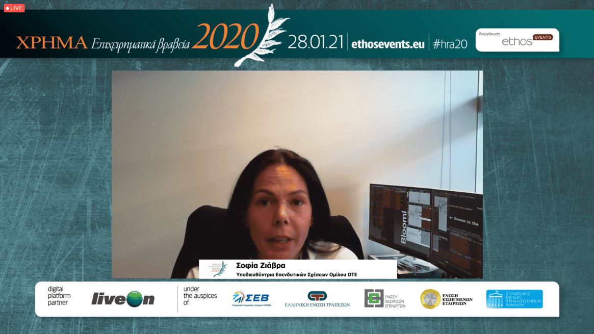 Η κα Χαρούλα Απαλαγάκη, Γενική Γραμματέας της Ελληνικής Ένωσης Τραπεζών, τόνισε πως «Είναι εξαιρετικά παρήγορο να ακούει κανείς πόσα έχει καταφέρει το ελληνικό επιχειρείν σε μια τόσο δύσκολη περίοδο. Είναι εξαιρετικά αισιόδοξο το μήνυμα που δίνει η βράβευση όλων αυτών των εταιρειών σε τόσο διαφορετικά πεδία. Σε ό,τι αφορά τον τραπεζικό κλάδο, ανέφερε ότι «το 2020 υπήρξε πολύ μεγάλη πιστωτική επέκταση στον ιδιωτικό τομέα, ύψους 20,5 δισ. ευρώ, με πρώτο τον κλάδο του λιανεμπορίου». Όπως χαρακτηριστικά ανέφερε «Οι τράπεζες κατάφεραν να διαχειριστούν το δύσκολο τομέα των NPLs. Η σελίδα της επόμενης ημέρας αφορά την ανάκαμψη σε επίπεδο ανάπτυξης και πόρων».