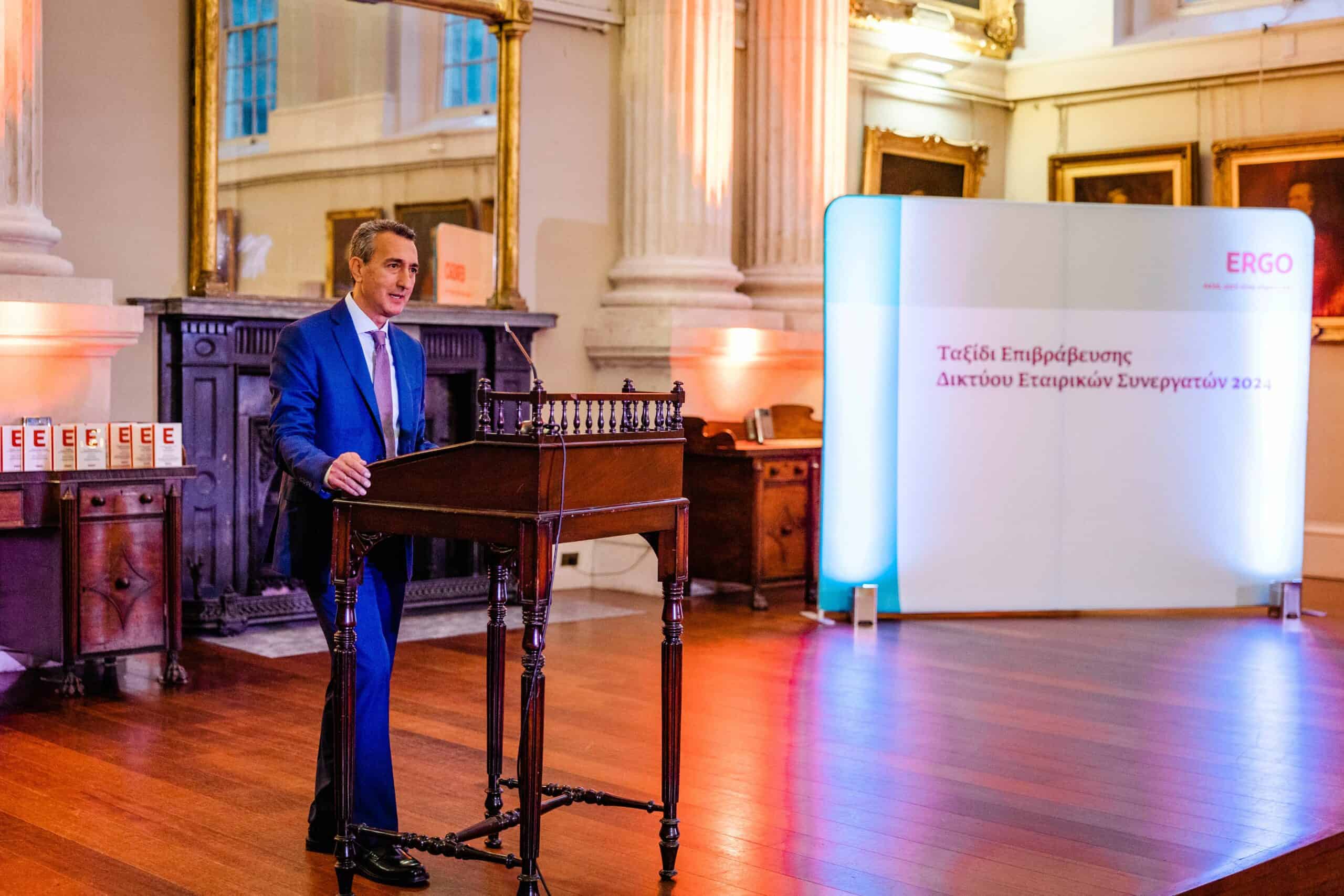Ο CEO της ERGO Ασφαλιστικής, κ. Ερρίκος Μοάτσος, εξέφρασε τη χαρά του που βρέθηκε στο ταξίδι επιβράβευσης των συνεργατών του εταιρικού δικτύου για πρώτη φορά μετά την ανάληψη των καθηκόντων του και τους ενθάρρυνε να συνεχίσουν την εξαιρετική τους δουλειά. Απευθυνόμενος στους παρευρισκόμενους, δήλωσε: «Είναι πραγματική χαρά για μένα να βρίσκομαι μαζί σας σε αυτή τη λαμπρή βραδιά. Ο ρόλος του ασφαλιστικού διαμεσολαβητή ως πραγματικού συμβούλου παραμένει αναντικατάστατος και ιδιαίτερα κρίσιμος. Είμαστε αισιόδοξοι για την ανάπτυξη του κλάδου μας, ο οποίος αναδεικνύεται σε πυλώνα θωράκισης της κοινωνίας και προώθησης της οικονομίας. Απόψε, γιορτάζουμε όχι μόνο τους βραβευμένους συνεργάτες μας, αλλά και τη συνολική προσπάθεια και αφοσίωση του εταιρικού μας δικτύου. Συγχαρητήρια σε όλους για την αποτελεσματική σας δουλειά και θερμές ευχαριστίες για τη συμβολή σας στην κοινή μας αναπτυξιακή πορεία».
