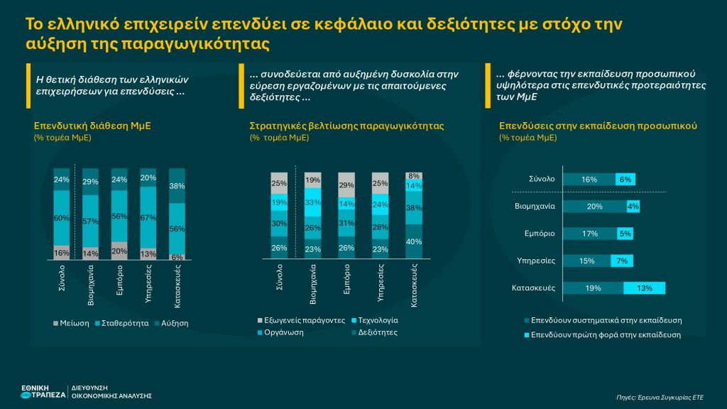 Το κεντρικό ερώτημα είναι κατά πόσο η αυξημένη επενδυτική διάθεση μπορεί να μεταφραστεί σε ουσιαστική βελτίωση της παραγωγικότητας – πεδίο στο οποίο η Ελλάδα εξακολουθεί να εμφανίζει υστέρηση περίπου 40% έναντι της ΕΕ. Η έρευνα δείχνει ότι οι επιχειρήσεις κινούνται προς τη σωστή κατεύθυνση, ενισχύοντας παράλληλα τις επενδύσεις σε ανθρώπινο κεφάλαιο. Ειδικότερα, οι ελληνικές ΜμΕ: