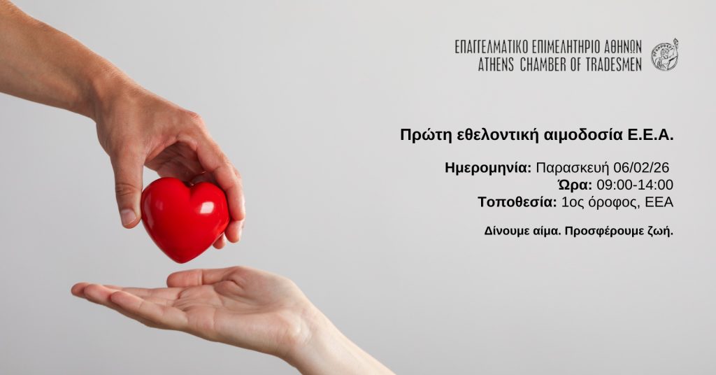 Με το σύνθημα «Δίνουμε αίμα. Προσφέρουμε ζωή», το Επαγγελματικό Επιμελητήριο Αθηνών απευθύνει ανοιχτό κάλεσμα συμμετοχής, αποδεικνύοντας έμπρακτα ότι η κοινωνική ευθύνη ξεκινά από την πράξη.