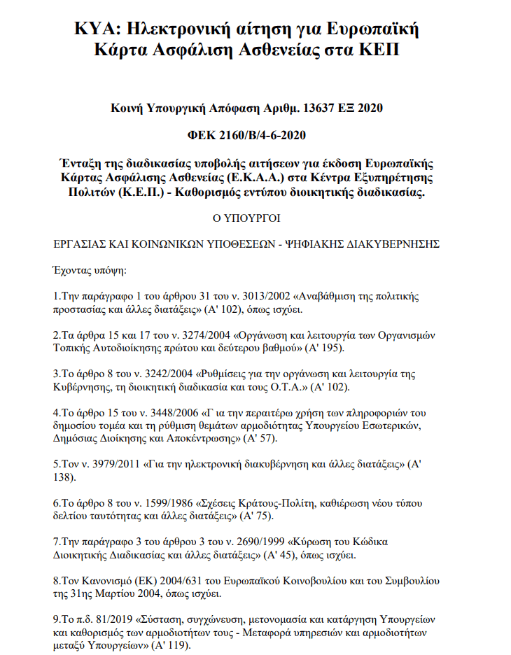 Την δωρεάν ευρωπαϊκή κάρτα ασφάλισης ασθένειας θα μπορούν να αποκτήσουν οι πολίτες τώρα και μέσω ΚΕΠ. Η κάρτα προσφέρει πρόσβαση σε ιατρικά αναγκαία, κρατική περίθαλψη κατά την προσωρινή διαμονή στις χώρες της ΕΕ, την Ισλανδία, το Λιχτενστάιν, τη Νορβηγία και την Ελβετία, με τους ίδιους όρους και το ίδιο κόστος (σε ορισμένες χώρες, δωρεάν) με τους ασφαλισμένους της εν λόγω χώρας. Οι κάρτες εκδίδονται από τον εθνικό πάροχο ασφάλισης ασθένειας.