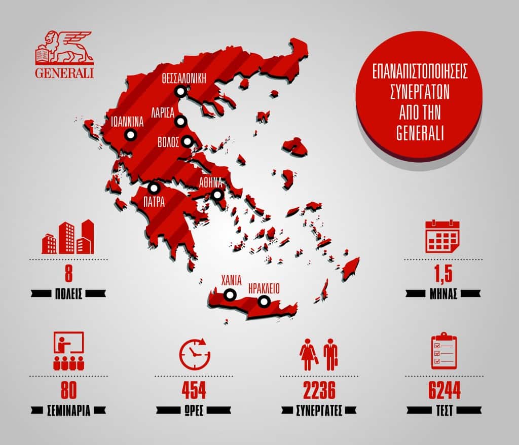 Στελέχη του Τμήματος Εκπαίδευσης, τα οποία διακρίνονται για τη μακρόχρονη εμπειρία τους και την υψηλή τους εξειδίκευση, ταξίδεψαν, μέσα σε μόλις 1,5 μήνα, σε 8 πόλεις, διοργανώνοντας συνολικά 80 σεμινάρια και για τους 3 Τομείς Επαναπιστοποίησης. Συνολικά, συμμετείχαν 2236 Συνεργάτες της Generali οι οποίοι πέρασαν επιτυχώς 6244 τεστ αξιολόγησης και έλαβαν την απαραίτητη πιστοποίηση για το έτος 2015.