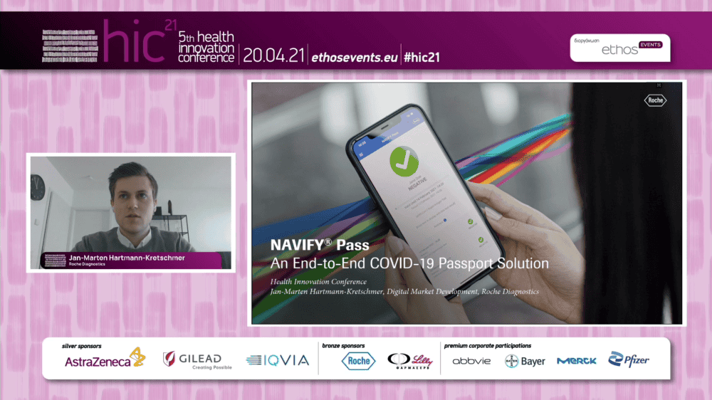 - Το ψηφιακό διαβατήριο NAVIFY Pass, το οποίο έχει αναπτύξει η εταιρεία Roche Diagnostics. Αφορά μία εφαρμογή που έχει αναπτύξει η εταιρεία, η οποία εγκαθίσταται στα εργαστήρια, εμβολιαστικά κέντρα και στο smartphone των πολιτών και μπορεί να περιλαμβάνει πληροφορίες για διαγνωστικές εξετάσεις του ιού SARS-COV-2, αλλά και τον εμβολιασμό.