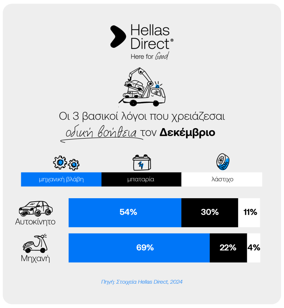 Καθώς οι θερμοκρασίες πέφτουν και οι καιρικές συνθήκες γίνονται πιο απαιτητικές, η ανάγκη για οδική βοήθεια γίνεται πιο συγκεκριμένη. Όπως δείχνουν τα στοιχεία της Hellas Direct από τον Δεκέμβριο του 2024, οι τρεις βασικοί λόγοι που καλούν οι οδηγοί την οδική βοήθεια για αυτοκίνητο και για μηχανή είναι η μηχανική βλάβη, το πρόβλημα στην μπαταρία και τα λάστιχα.