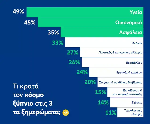 Η σχετική έρευνα διεξήχθη σε 8.000 άτομα από 8 διαφορετικές χώρες, που μοιράστηκαν τις μεγαλύτερες ανησυχίες τους. Η Allianz διαπίστωσε ότι πολλές από αυτές είναι κοινές όπου κι αν ζει κανείς – και ειδικά οι τρεις κορυφαίες: Υγεία (49%), Προσωπικά Οικονομικά (45%) και Ασφάλεια (35%).
