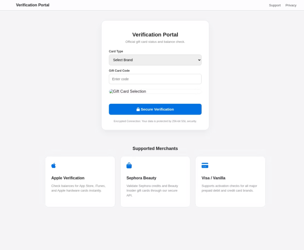 Το σύστημα ανίχνευσης phishing της Kaspersky εντόπισε παραπλανητικές πλατφόρμες που προσφέρουν στα θύματα ένα «ασφαλές» σύστημα για να ελέγξουν την εγκυρότητα, την κατάσταση ή το υπόλοιπο της δωροκάρτας τους. Στοχοποιούν άτομα που έχουν λάβει πρόσφατα κάποια δωροκάρτα και οι phishers κλέβουν τα στοιχεία ταυτοποίησης της κάρτας αποκτώντας τη δυνατότητα να ενεργοποιήσουν το κουπόνι πριν από τον ίδιο τον χρήστη.