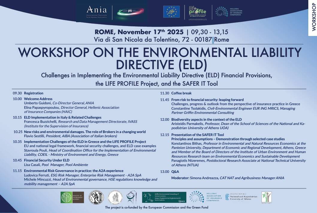 H Ένωση Ασφαλιστικών Εταιριών Ελλάδος (ΕΑΕΕ) και η Ένωση Ασφαλιστικών Εταιριών Ιταλίας (ΑΝΙΑ) συνδιοργανώνουν τη Δευτέρα 17 Νοεμβρίου 2025 ημερίδα με τίτλο «Προκλήσεις στην εφαρμογή της Οδηγίας για την Περιβαλλοντική Ευθύνη (Environmental Liability Directive – ELD): Χρηματοοικονομική ασφάλεια, το πρόγραμμα LIFE PROFILE και το ψηφιακό εργαλείο SAFER».