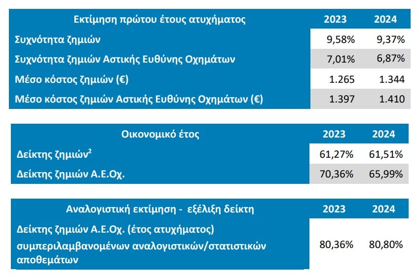 κλάδων 3. Χερσαίων οχημάτων και 10. Αστικής ευθύνης χερσαίων οχημάτων) του έτους 2024 ήταν 1,23 δισ. €, αυξημένη κατά 5,12% σε σχέση με το 2023. Την ίδια χρονιά οι ασφαλίσεις κατά ζημιών συνολικά κατέγραψαν παραγωγή 3,08 δισ. €, αυξημένη κατά 7,84% έναντι της προηγούμενης χρονιάς.