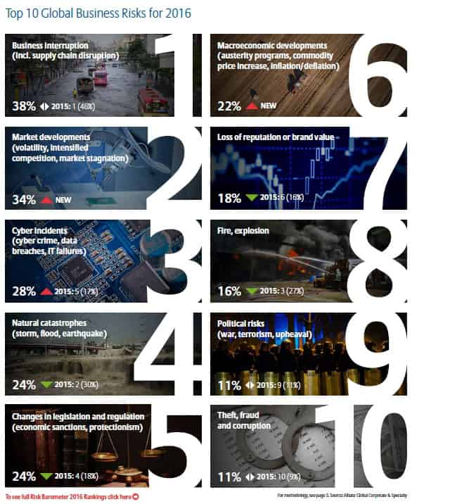 Η διαταραχή/διακοπή εργασιών (business interruption) παραμένει ο κορυφαίος κίνδυνος που αντιμετωπίζουν οι επιχειρήσεις διεθνώς για το 2016,  σύμφωνα με την  έρευνα Allianz Risk Barometer που καταρτίζει κάθε χρόνο (αρχής γενομένης από το 2011) ο γερμανικός ασφαλιστικός κολοσσός Allianz και στην οποία συμμετείχαν φέτος πάνω από 800 ειδικοί του κλάδου από 40 χώρες.