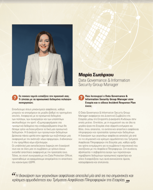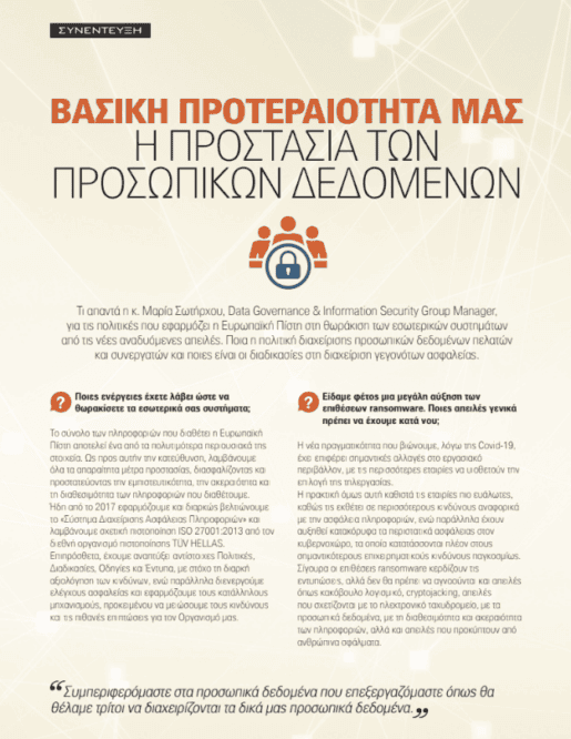 Τι απαντά η κ. Μαρία Σωτήρχου, Data Governance & Information Security Group Manager, για τις πολιτικές που εφαρμόζει η Ευρωπαϊκή Πίστη στη θωράκιση των εσωτερικών συστημάτων από τις νέες αναδυόμενες απειλές. Ποια η πολιτική διαχείρισης προσωπικών δεδομένων πελατών και συνεργατών και ποιες είναι οι διαδικασίες στη διαχείριση γεγονότων ασφαλείας.