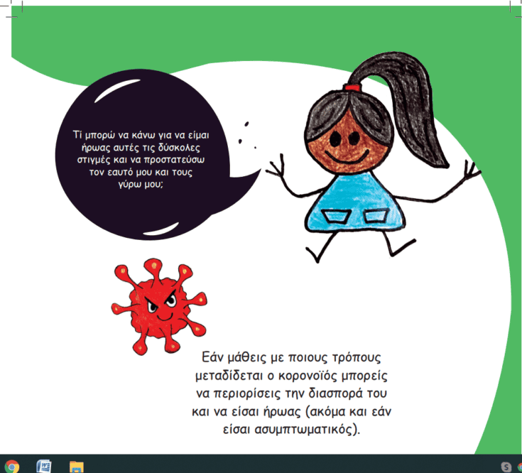 «Βλέπεις αυτό το μικρό πλασματάκι? Όσο μικρό και αθώο και να φαίνεται, είναι κακό, και καταφέρνει να κρύψει τον πραγματικό του εαυτό με μεγάλη άνεση. Είναι ένας ιός που ονομάζεται κορονοϊός, αλλά ίσως να τον ξέρεις και ως “COVID-19” ή “SARS-Cov-2”. Παρ’ όλο που είναι κακός, είναι περίπου 4.000 φορές μικρότερος από μυρμήγκι»!