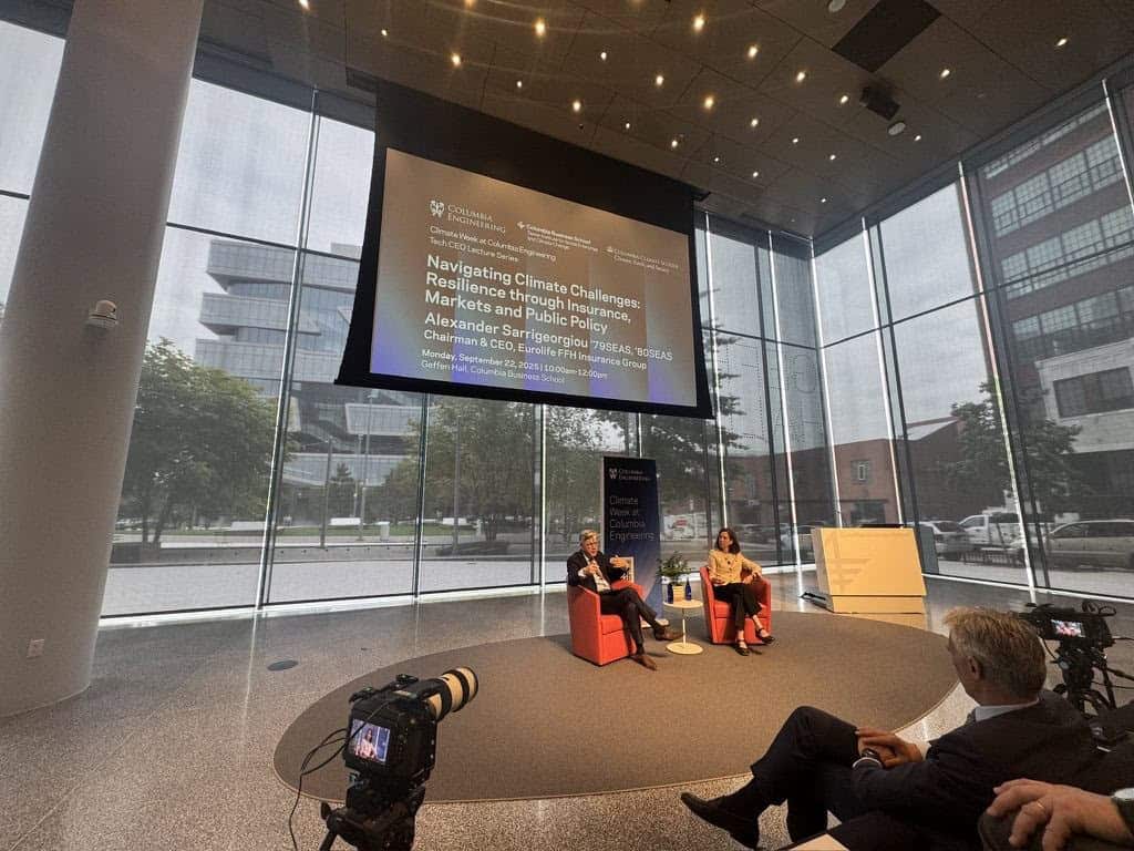 Στη συνομιλία του με την Κοσμήτορα του Columbia Climate School Alexis Abramson, παρουσία των φοιτητών του Columbia, ο Αλέξανδρος Σαρρηγεωργίου μίλησε για το πώς η κλιματική αλλαγή αναδιαμορφώνει την ασφαλιστική αγορά παγκοσμίως, τον ρόλο της Τεχνητής Νοημοσύνης, καθώς και το ότι o ασφαλιστικός κλάδος είναι πολύ πιο δυναμικός από ό,τι ορισμένοι μπορεί να θεωρούν.