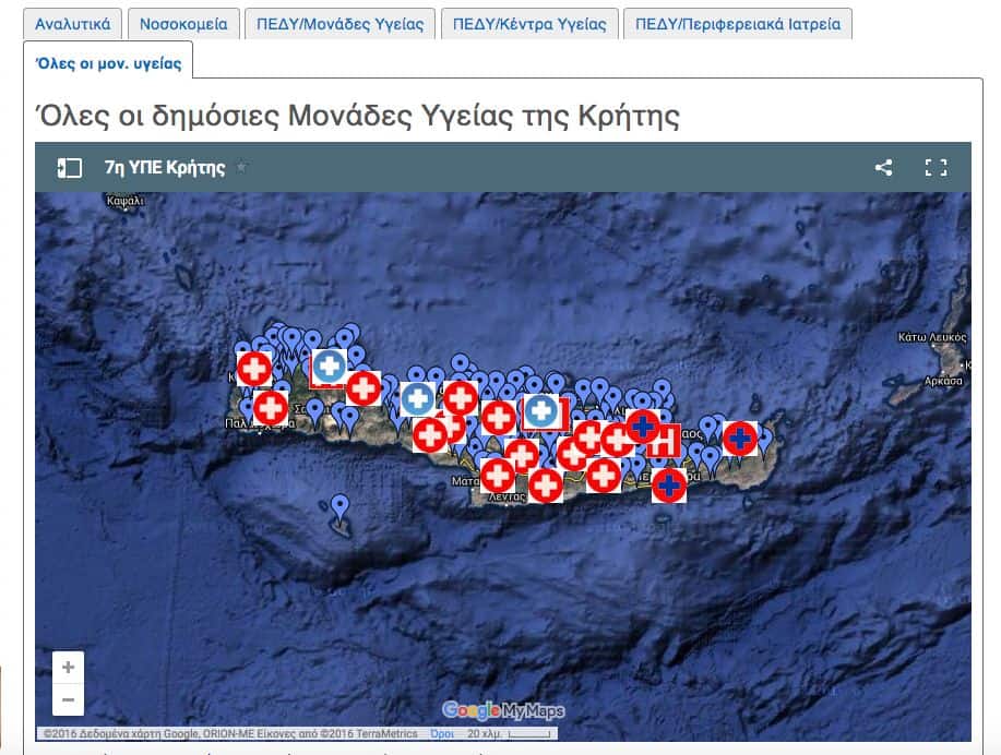Το Χάρτη Υγείας της Κρήτης παρουσίασε στον Υπουργό και τον Αναπληρωτή Υπουργό η Διοίκηση της 7ης Υγειονομικής Υπηρεσίας σε ευρεία σύσκεψη, στην οποία συμμετείχαν και οι διοικήσεις των νοσοκομείων. Το εγχείρημα υλοποιήθηκε τους τελευταίους μήνες, με μηδενικό κόστος σύμφωνα με την ΥΠΕ, ενώ περιλαμβάνει την πλήρη εικόνα του νησιού και στους 4 νομούς της Κρήτης, στους 24 Δήμους και τους υφιστάμενους οικισμούς.