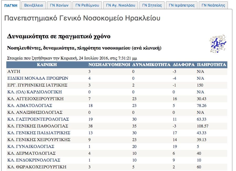 Ειδικότερα, είναι δυνατόν να δει κανείς τον αριθμό των νοσηλευθέντων, τη δυναμικότητα και την πληρότητα του νοσοκομείου ανά κλινική. Όπως αναφέρεται στη σελίδα του Χάρτη Υγείας, μπορεί κανείς να δει: