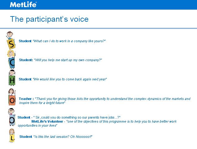 Η MetLife ξεκίνησε την πρωτοβουλία αυτή πριν από δύο χρόνια σε συνεργασία με τον παγκόσμιο οργανισμό εκπαίδευσης & επιχειρηματικότητας Junior Achievement Worldwide (JA), που παρέχει εγκεκριμένα εκπαιδευτικά προγράμματα σε πάνω από 35 χώρες στην Περιφέρεια Ευρώπης, Μέσης Ανατολής και Ασίας κι αποτελεί την πρώτη δράση του έργου του Ιδρύματος MetLife με στόχο την οικονομική ένταξη/ενσωμάτωση των οικονομικά ασθενών πληθυσμών.