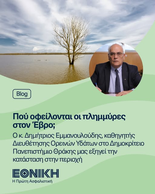 Στο επίκεντρο της επιστημονικής ανάλυσης μπαίνουν οι πρόσφατες εκτεταμένες πλημμύρες στον Έβρο, που δοκίμασαν τις αντοχές των κατοίκων και της τοπικής οικονομίας, αφήνοντας πίσω τους μεγάλες εκτάσεις γης κάτω από το νερό. Με αφορμή το φαινόμενο, η Εθνική Ασφαλιστική φιλοξενεί σε ενημερωτικό της άρθρο την επιστημονική τοποθέτηση του καθηγητή Δημήτριου Εμμανουλούδη, από το Τμήμα Φυσικού Περιβάλλοντος και Κλιματικής Ανθεκτικότητας του Δημοκρίτειου Πανεπιστημίου Θράκης, ο οποίος αναλύει τους λόγους που οδήγησαν στη μεγαλύτερη πλημμύρα της τελευταίας δεκαετίας στην περιοχή.