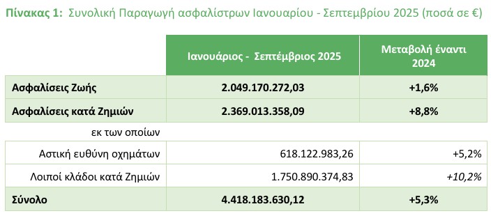 Κατά 5,3% αυξήθηκε η συνολική παραγωγή ασφαλίστρων το διάστημα Ιανουαρίου-Σεπτεμβρίου 2025 έναντι του αντίστοιχου περσινού διαστήματος, προσεγγίζοντας τα 4,42 δισ. ευρώ.