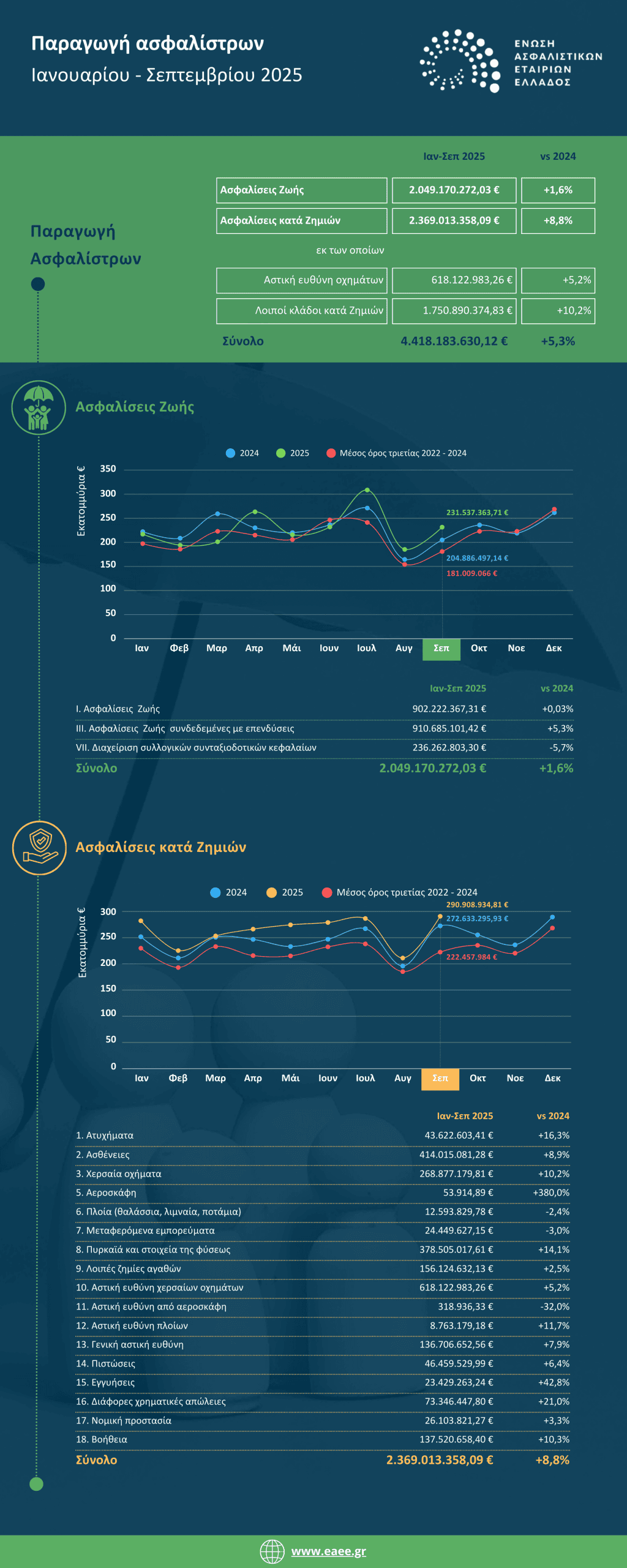 Σε δωδεκάμηνη βάση, η παραγωγή του δωδεκαμήνου Οκτωβρίου 2024 – Σεπτεμβρίου 2025, σε σύγκριση με την αντίστοιχη παραγωγή του δωδεκαμήνου Οκτωβρίου 2023 – Σεπτεμβρίου 2024, καταγράφει αύξηση κατά 4,8%. Αναλύεται σε αύξηση 1,5% για τις ασφαλίσεις Ζωής και αύξηση 7,8% για τις ασφαλίσεις κατά Ζημιών.