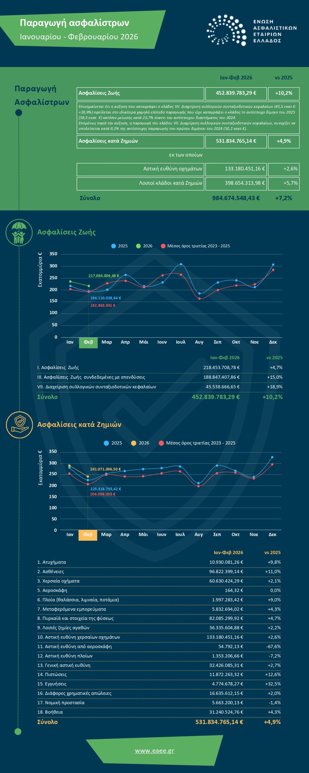 Επισημαίνεται, επίσης, ότι η αύξηση που καταγράφει ο κλάδος διαχείρισης συλλογικών συνταξιοδοτικών κεφαλαίων (45,5 εκατ. ευρώ, + 18,9%) οφείλεται στο ιδιαίτερα χαμηλό επίπεδο παραγωγής του αντίστοιχου διμήνου 2025 (38,3 εκατ. ευρώ), κατόπιν μείωσης κατά 23,7% έναντι του αντίστοιχου διαστήματος του 2024 (η αντίστοιχη μελέτη εδώ). Επομένως παρά την αύξηση, η παραγωγή του κλάδου συνεχίζει να υπολείπεται κατά 9,3% της αντίστοιχης παραγωγής του πρώτου διμήνου του 2024 (50,2 εκατ. ευρώ).