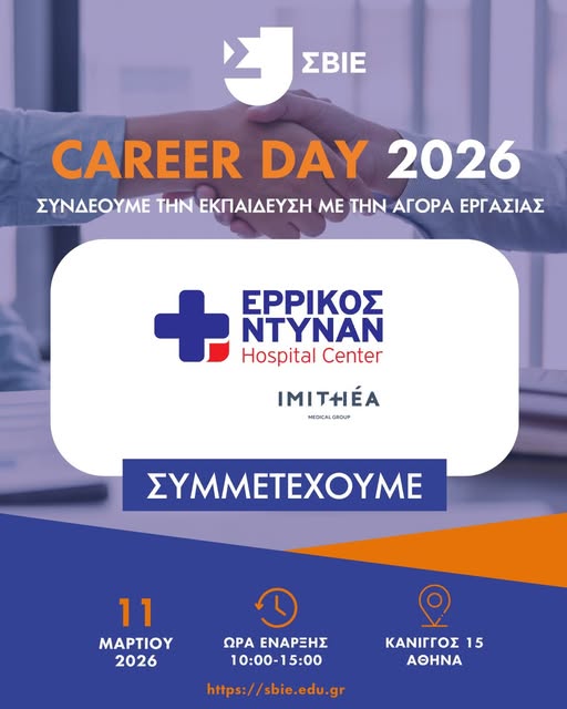 Το Ερρίκος Ντυνάν Hospital Center συμμετέχει ενεργά στην Ημέρα Καριέρας 2026 που διοργανώνει η ΣΒΙΕ, δίνοντας τη δυνατότητα σε σπουδαστές και αποφοίτους του τομέα υγείας να γνωρίσουν από κοντά τις επαγγελματικές προοπτικές στον χώρο της νοσηλευτικής.
