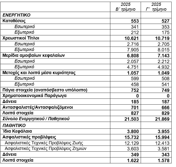 Από την πλευρά του παθητικού, τα ίδια κεφάλαια αυξήθηκαν στα 3.955 εκατ. ευρώ στο τέλος του γ΄ τριμήνου του 2025, έναντι 3.800 εκατ. ευρώ το προηγούμενο τρίμηνο. Οι ασφαλιστικές τεχνικές προβλέψεις αυξήθηκαν κατά 262 εκατ. ευρώ και διαμορφώθηκαν στα 15.994 εκατ. ευρώ. Αναλυτικότερα, οι ασφαλιστικές τεχνικές προβλέψεις ζωής αυξήθηκαν κατά 284 εκατ. ευρώ και διαμορφώθηκαν στα 12.413 εκατ. ευρώ, ενώ οι τεχνικές προβλέψεις ζημιών μειώθηκαν κατά 22 εκατ. ευρώ και διαμορφώθηκαν στα 3.581 εκατ. ευρώ. Από το σύνολο των τεχνικών προβλέψεων, το 77,6% αντιστοιχεί σε τεχνικές προβλέψεις ζωής.