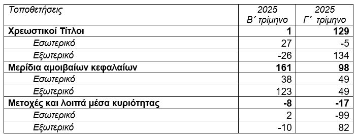 Η αξία των συνολικών τοποθετήσεων σε μετοχές και λοιπά μέσα κυριότητας μειώθηκε στα 1.049 εκατ. ευρώ, έναντι 1.057 εκατ. ευρώ το προηγούμενο τρίμηνο, εξέλιξη που οφείλεται κυρίως σε καθαρές πωλήσεις μετοχών του εσωτερικού, οι οποίες αντισταθμίστηκαν εν μέρει από καθαρές αγορές μετοχών του εξωτερικού. Το ποσοστό των συνολικών τοποθετήσεων σε μετοχές επί του συνόλου του ενεργητικού παρέμεινε σχεδόν αμετάβλητο στο 4,8% το γ΄ τρίμηνο του 2025.