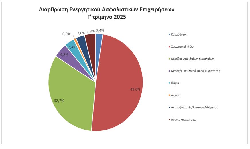 Η αξία των συνολικών τοποθετήσεων των ασφαλιστικών επιχειρήσεων σε χρεωστικούς τίτλους αυξήθηκε στα 10.719 εκατ. ευρώ στο τέλος του γ΄ τριμήνου του 2025, έναντι 10.621 εκατ. ευρώ το προηγούμενο τρίμηνο, εξέλιξη που οφείλεται κυρίως σε καθαρές αγορές ομολόγων του εξωτερικού. Το ποσοστό των χρεωστικών τίτλων επί του συνολικού ενεργητικού μειώθηκε στο 49,0% το γ΄ τρίμηνο του 2025, έναντι 49,4% το προηγούμενο τρίμηνο.