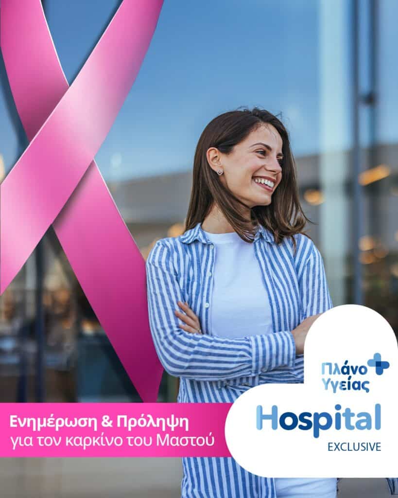 Ιδιαίτερα ενισχυμένο είναι το πρόγραμμα «Πλάνο Υγείας Hospital Exclusive», το οποίο, εκτός από την πλήρη κάλυψη των εξόδων μαστεκτομής σε περίπτωση καρκίνου του μαστού, περιλαμβάνει: